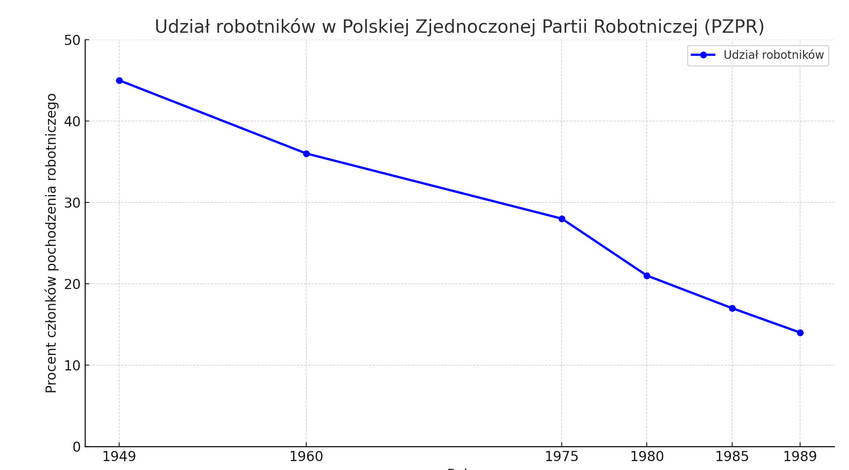Oto wykres przedstawiający spadek udziału robotników w PZPR w latach 1949–1989. Widać wyraźnie, że podobnie jak w przypadku KPZR, partia stopniowo traciła swój robotniczy charakter, stając się coraz bardziej organizacją biurokratyczno-urzędniczą.