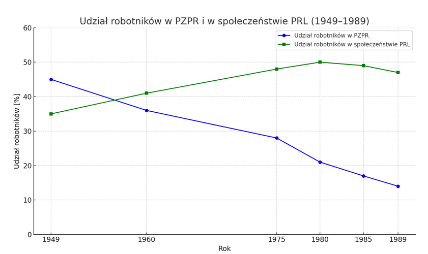 • Choć robotnicy stanowili rosnącą i dominującą część społeczeństwa PRL, ich reprezentacja w partii systematycznie malała.